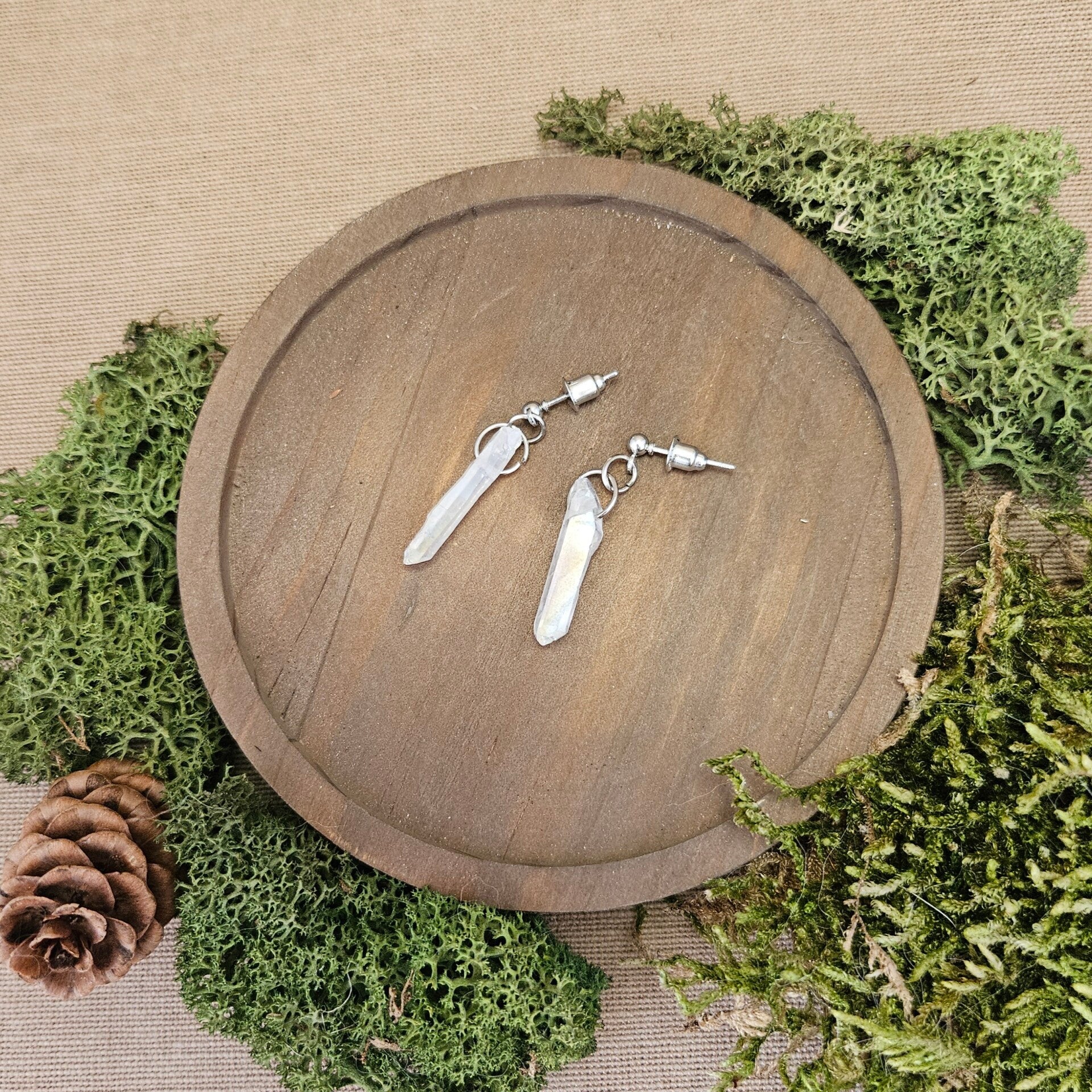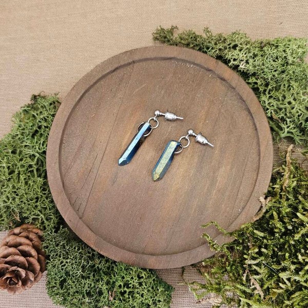 Discover exquisite Aura Quartz earrings at Vuorelta Design. Our handcrafted collection showcases the mesmerizing beauty of Aura Quartz crystals, known for their vibrant and ethereal hues. Elevate your style with these unique and spiritually charged earrings. Explore the harmonious blend of natural elegance and metaphysical allure today. The crystals are approximately 2/3 cm long.