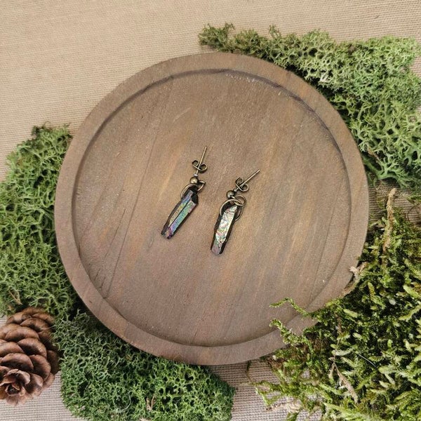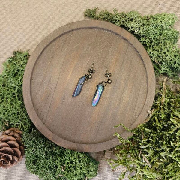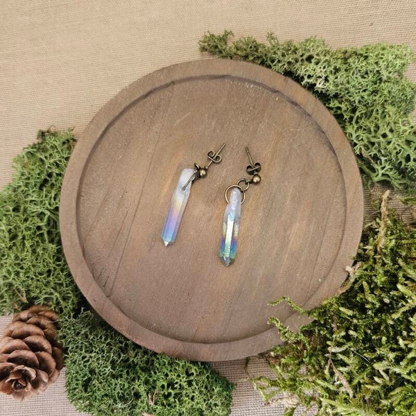 Discover exquisite Aura Quartz earrings at Vuorelta Design. Our handcrafted collection showcases the mesmerizing beauty of Aura Quartz crystals, known for their vibrant and ethereal hues. Elevate your style with these unique and spiritually charged earrings. Explore the harmonious blend of natural elegance and metaphysical allure today. The crystals are approximately 2/3 cm long.