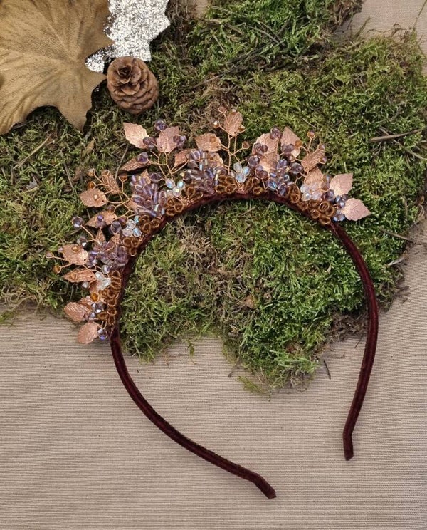 Experience the rustic charm of nature with our latest headpiece creation. This unique piece draws inspiration from the enchanting world of berry bushes, combining the rich hues of copper leaves, deep eggplant purple crystal beads, and warm brown accents.