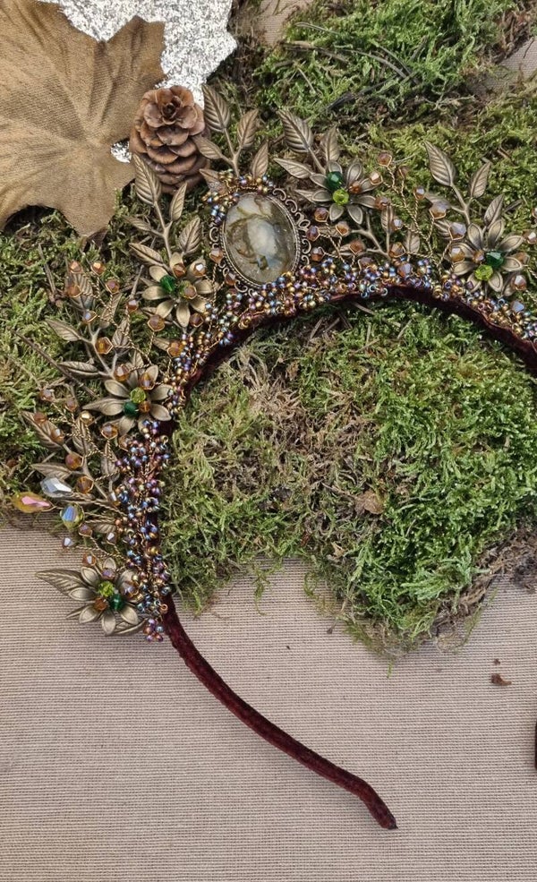 Adorned with bronze leaves and delicate flowers, this headpiece is a tribute to the rustic elegance of the woodland. At its center lies a mesmerizing cabochon adorned with real moss, bringing an authentic touch of nature to your ensemble.