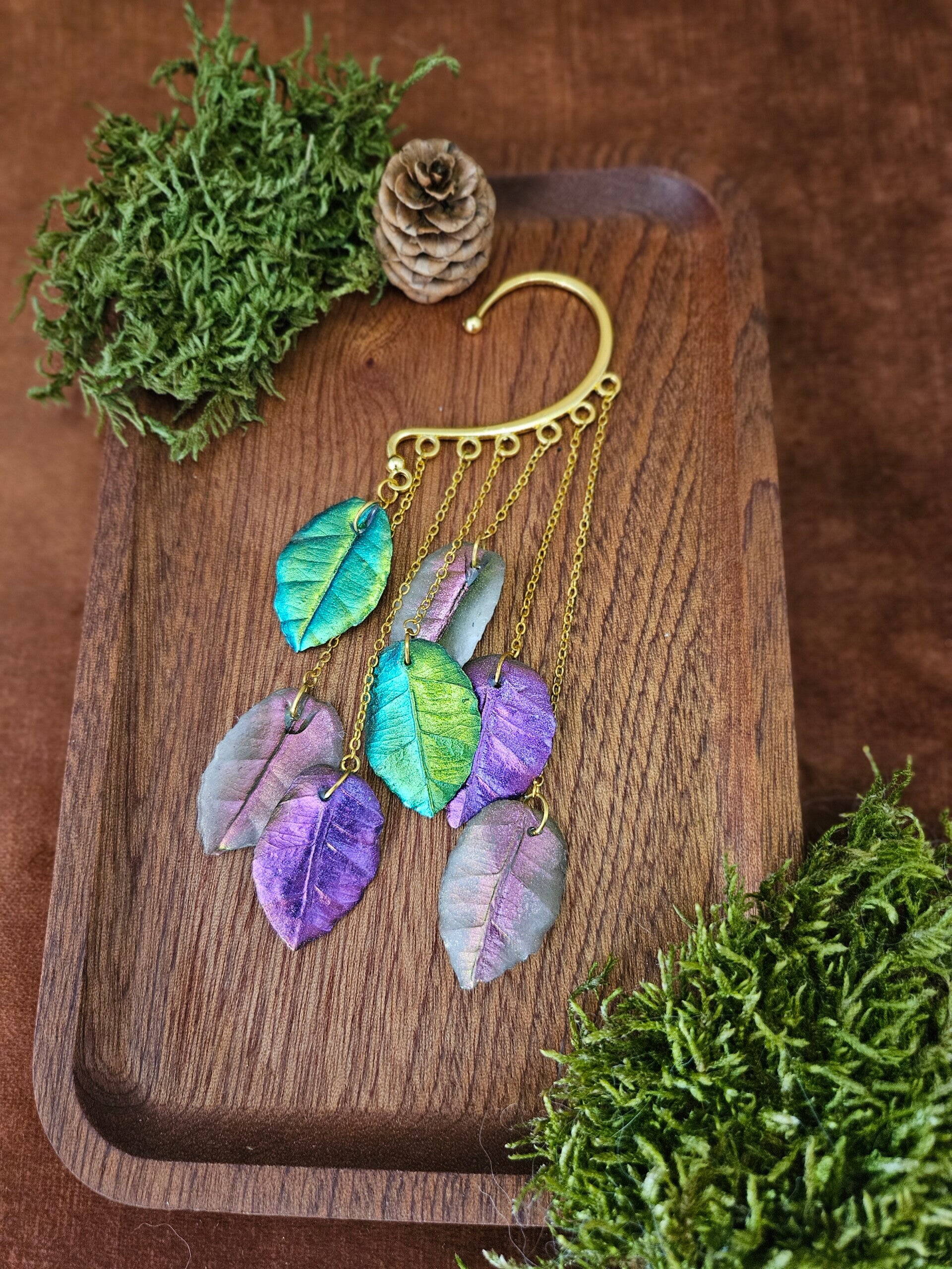 Add a touch of elegance to your look with our exquisite Sparkling Clay Leaves Earcuff. Designed to dazzle, this unique piece features delicate clay leaves that gracefully dangle from fine chains, catching the light with every movement.