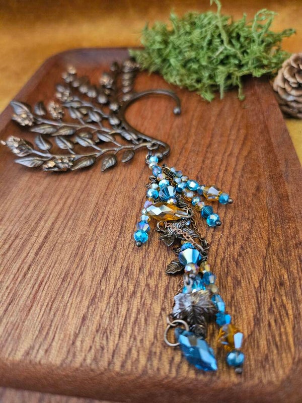 Embrace the beauty of nature with the Forest Enchanted Lake Earcuff, featuring intricate metal leaves and cascading blue crystals reminiscent of a serene woodland Lake scene. This handcrafted piece captures the essence of an enchanted foresty body of water, with shimmering blue tones that evoke a sense of mystery and magic. Perfect for anyone looking to add a touch of elegance and nature-inspired charm to their look, whether for a special event or everyday wear. Let this ear cuff transport you to a magical world.