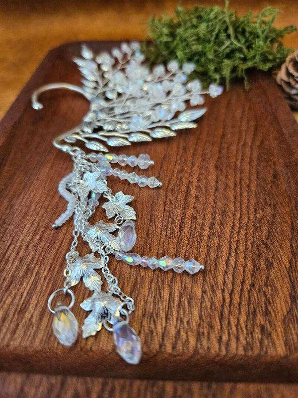 Embrace the ethereal beauty of winter with the Frosted Majesty Earcuff, a dazzling piece inspired by snowflakes and icy elegance. With shimmering white crystals and delicate silver leaves, this handcrafted ear cuff captures the essence of a snow queen’s regal grace. Perfect for those who want to embody the frosty magic of winter, it adds a touch of icy allure to both special occasions and everyday wear. Step into your own winter wonderland with this enchanting accessory