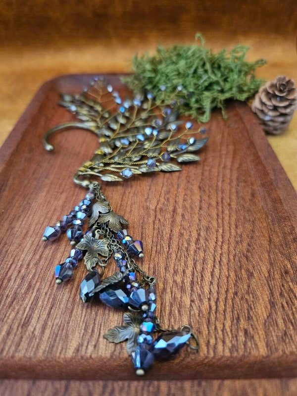 Step into the twilight with the Midnight Vine Earcuff, where dark purple crystals entwine with bronze leaves to create a piece filled with mystery and elegance. Handcrafted with intricate detail, this cuff evokes the magic of a vine stretching toward the night sky. Perfect for those who are drawn to a gothic, yet sophisticated aesthetic, this ear cuff brings an air of enchantment to any outfit